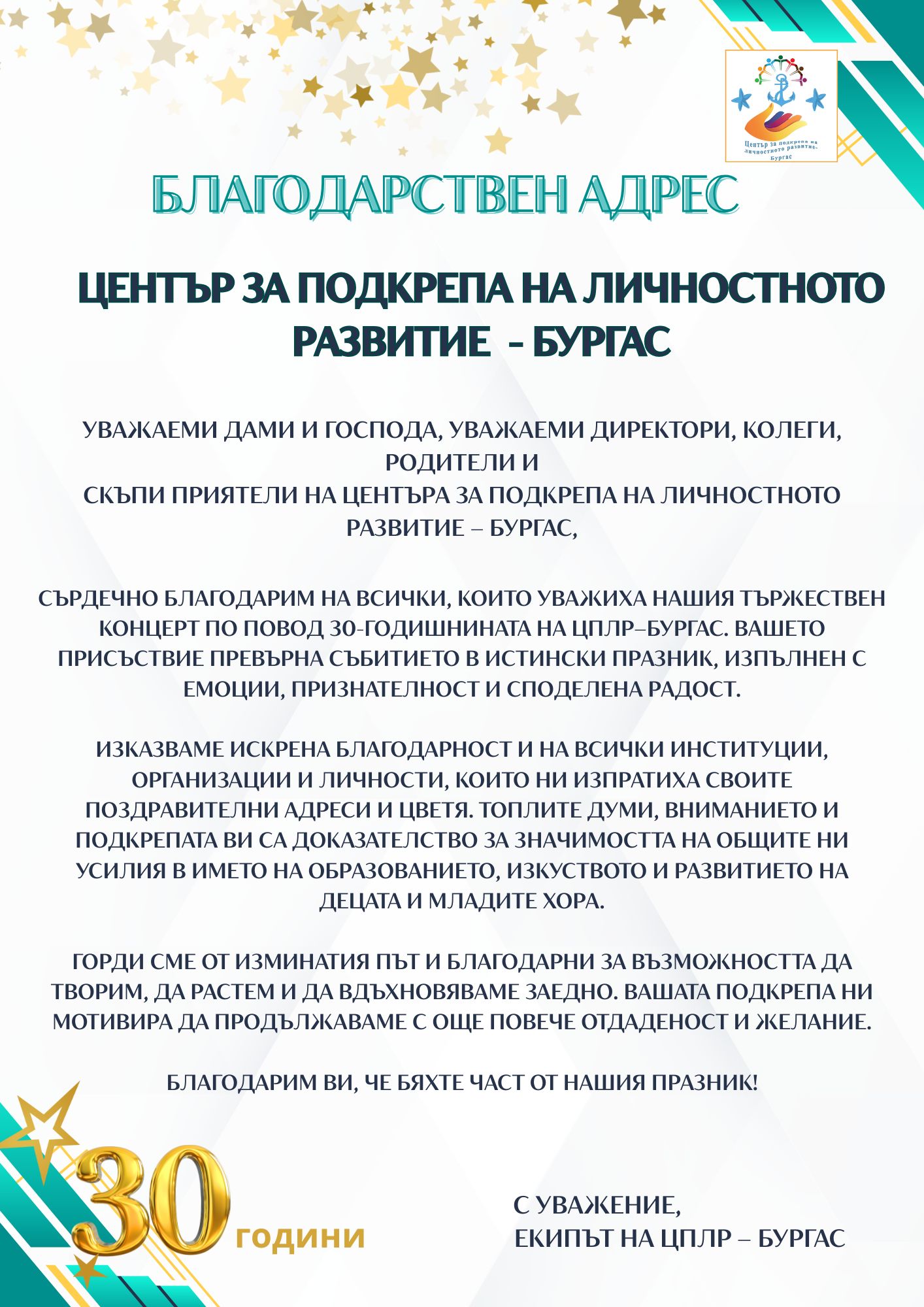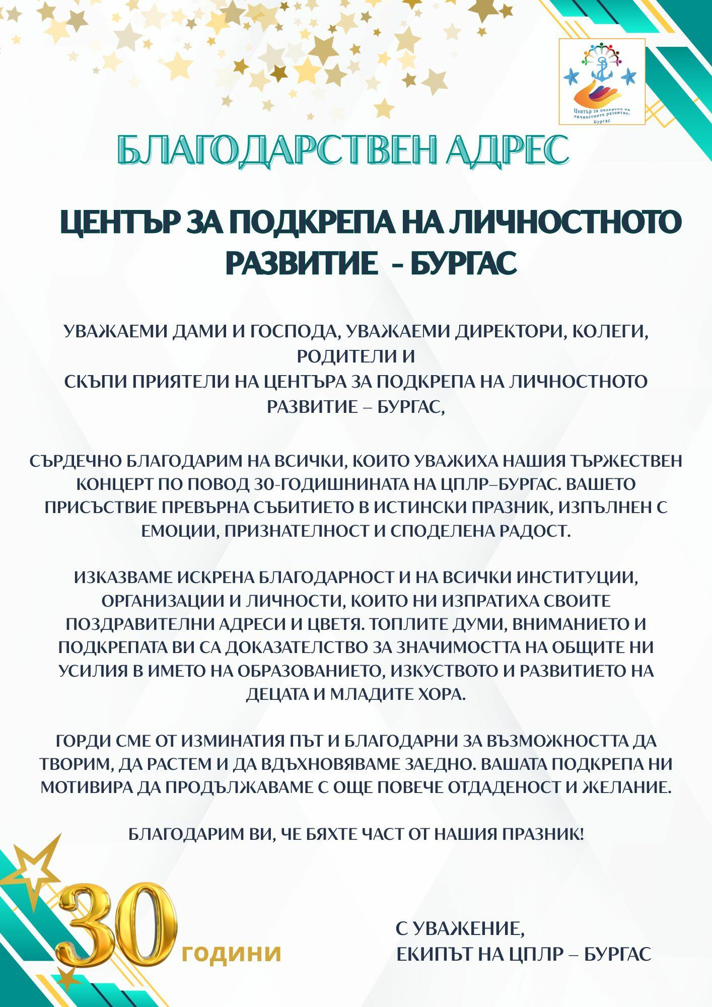 Сърдечно благодарим на всички, които уважиха нашия тържествен концерт по повод 30-годишнината на ЦПЛР–Бургас. Вашето присъствие превърна събитието в истински празник, изпълнен с емоции, признателност и споделена радост.