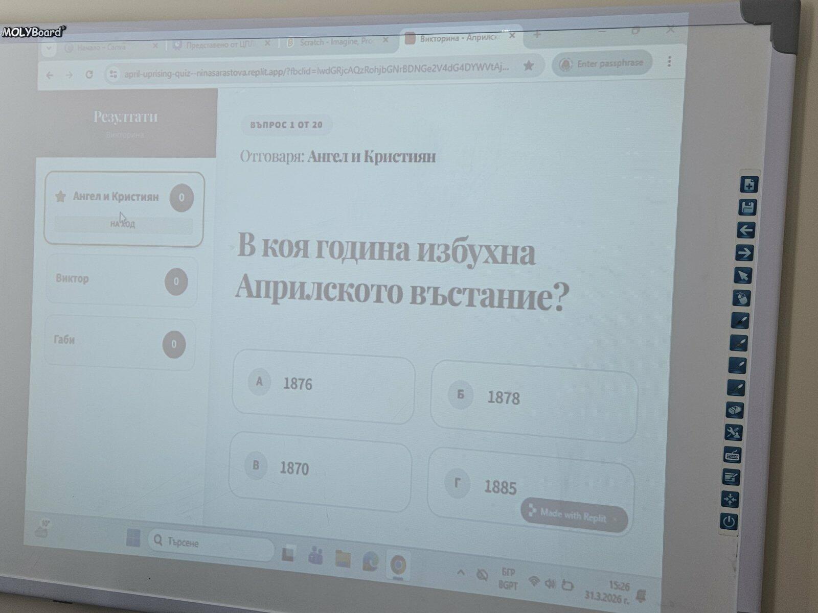От своя страна учениците от трети и четвърти клас в школата по компютърно моделиране и информационни технологии премериха знанията си в интерактивна викторина под надслов „Мисия: Априлско въстание“, а петокласниците и шестокласниците разработиха презентация, в която представиха ключови моменти и личности, свързани с въстанието.