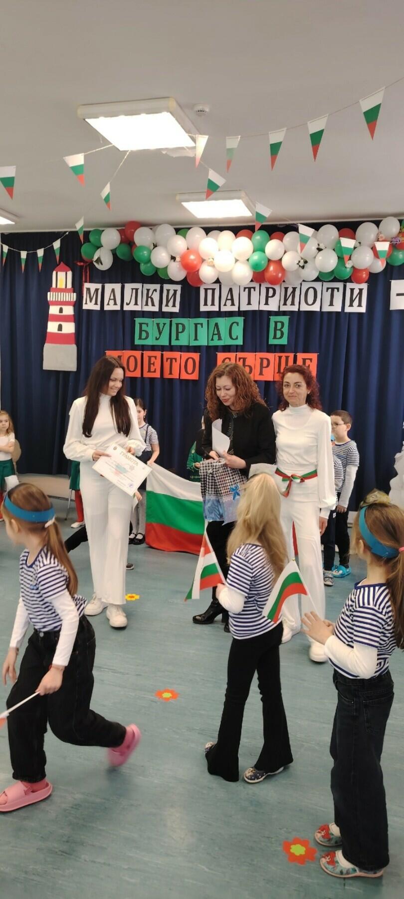 В ДГ „Раковина“ се проведе вдъхновяваща детска викторина на тема „Малки патриоти – Бургас в моето сърце“, организирана от Община Бургас и Цeнтър за подкрепа на личностното развитие – Бургас, която събра децата в едно вълнуващо пътешествие из историята, символите и красотата на родния град Бургас. Събитието премина в дух на сътрудничество, емоции и радост, като насърчи у децата любов към родния край и уважение към неговото минало и настояще. Участие взеха децата от трета група „Чайки", четвърта група „Морски перли“ и четвърта група „Морски звезди“. Специален гост на събитието бе г-жа Кичка Стефанова – директор на Център за подкрепа на личностното развитие – Бургас