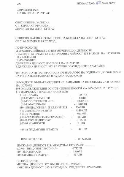 ПРЕДЛАГАМ ВИ ПОДРОБЕН БЮДЖЕТ ЗА 2025 г., 2024 г., 2023 г., 2022 г., 2021 г., 2020 г., 2019г., 2018 г., 2017 г., КАКТО И ИЗПЪЛНЕНИЕТО ЗА 2016 г. ПО БЮДЖЕТНИ ПЕРА. Обяснителна записка от директор ЦПЛР-Бургас, относно касовото изпълнение на бюджета.  Обща рекапитулация по параграфи - тримесечен отчет.