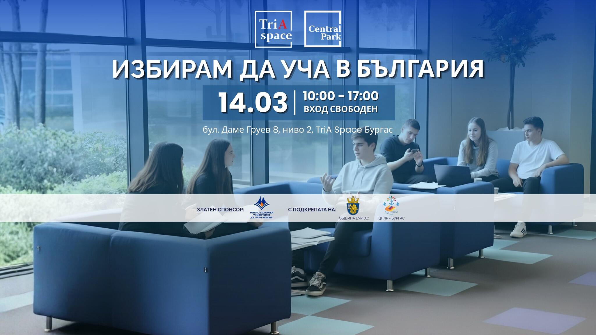 На 14 март 2026 г. в Central Park Бургас ще се проведе второто издание на образователното изложение „Избирам да уча в България“ - формат, който среща ученици, кандидат-студенти и родители директно с университети и училища от цялата страна.
