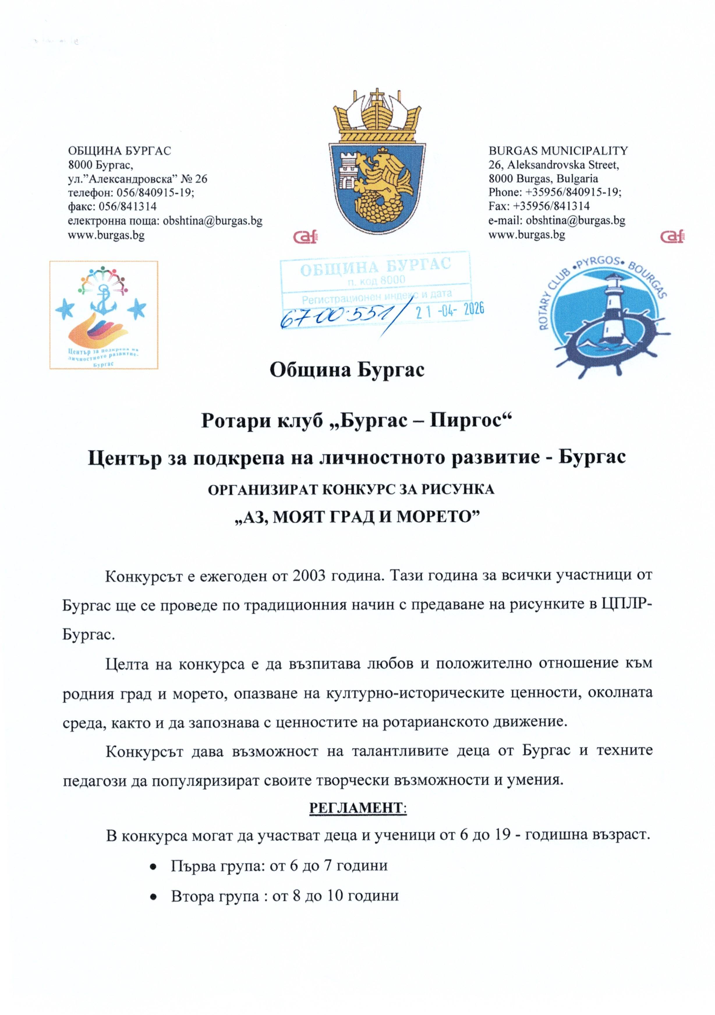 ОБЩИНА БУРГАС, РОТАРИ КЛУБ "БУРГАС-ПИРГОС" И ЦЕНТЪР ЗА ПОДКРЕПА НА ЛИЧНОСТНОТО РАЗВИТИЕ - БУРГАС организират конкурс за рисунка "Аз, моят град и морето" 2026 г.