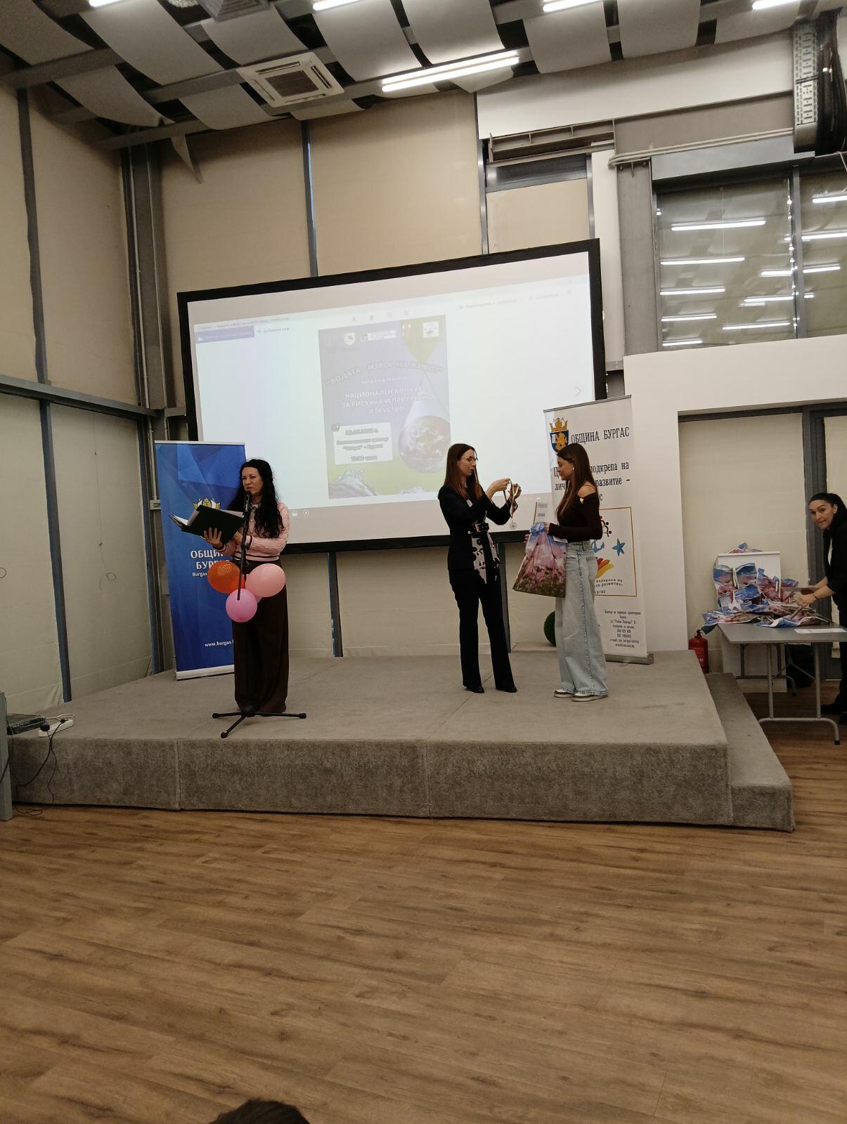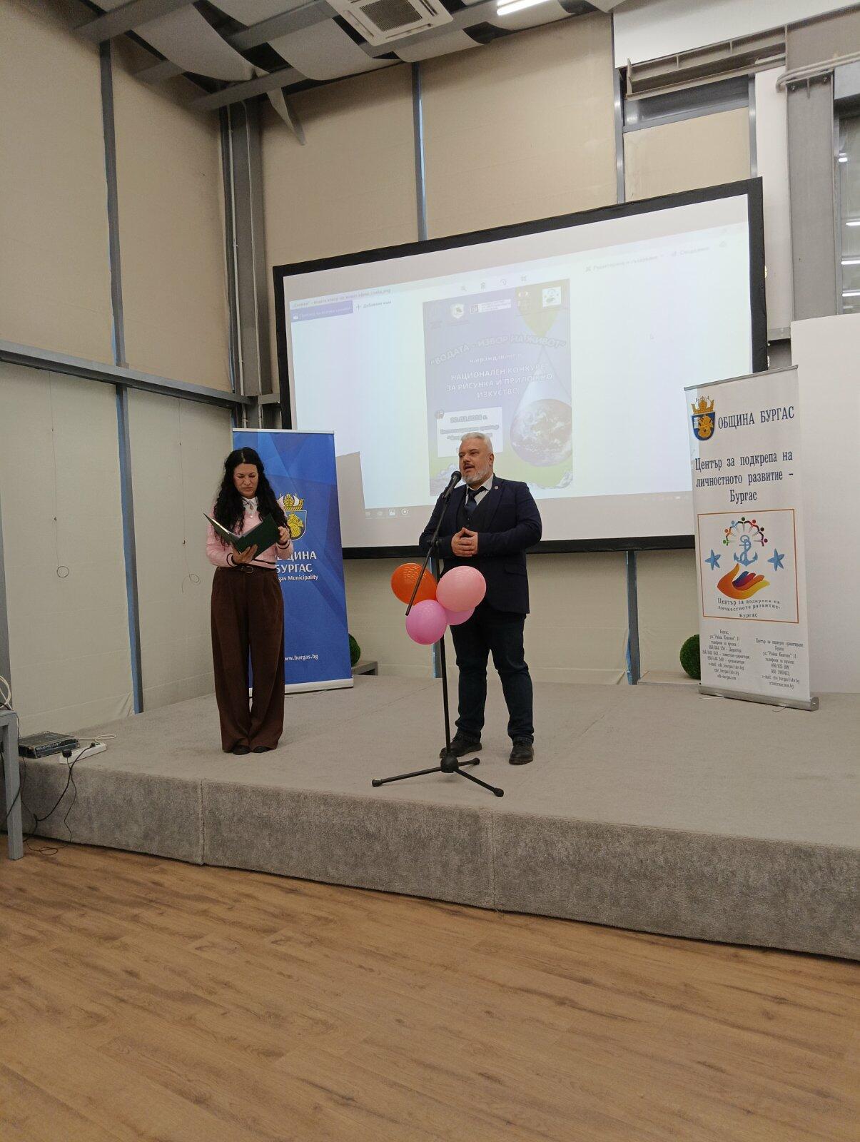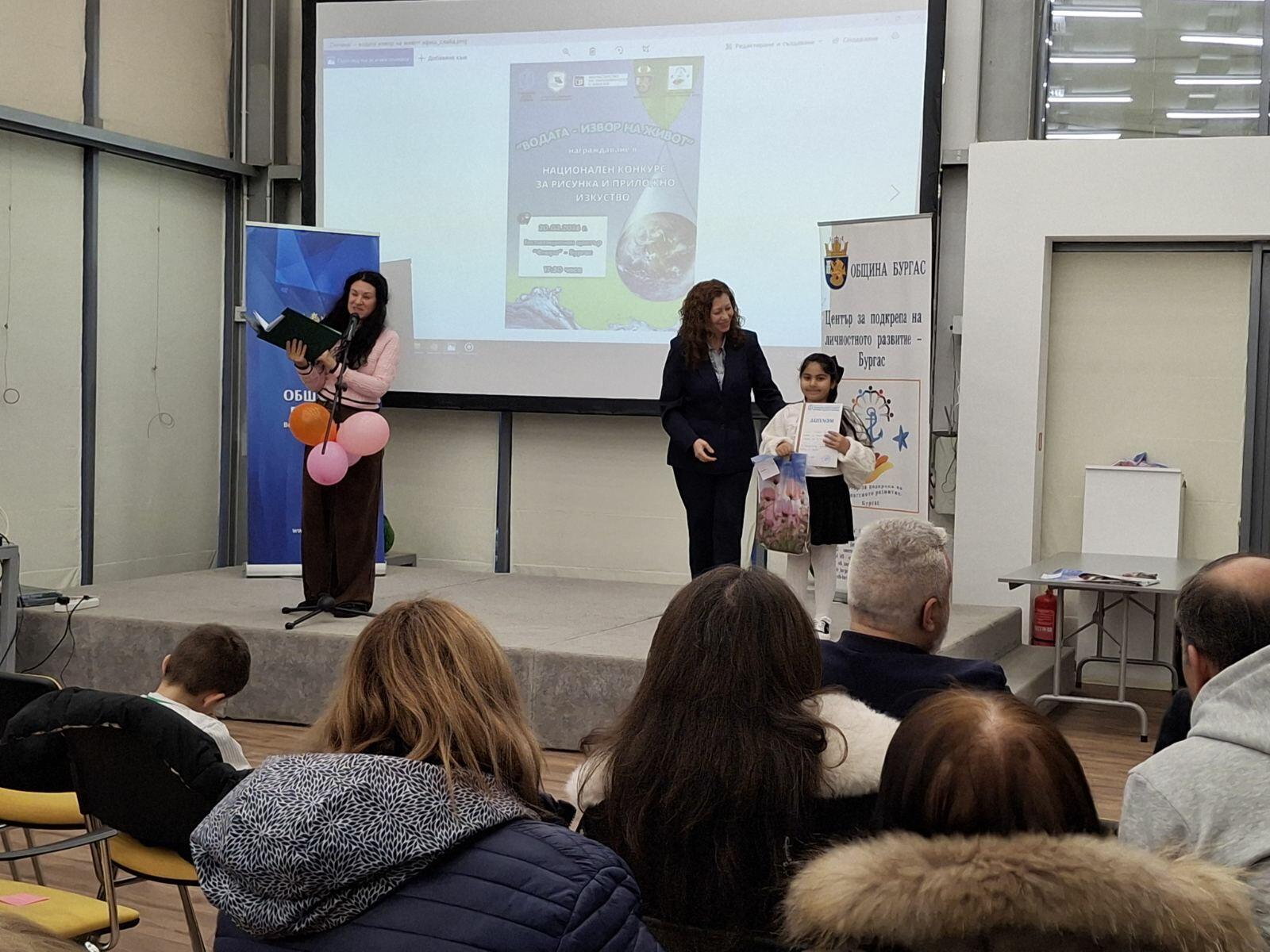 На тържествена церемония, проведена на 20 март 2026 г. в Експозиционен център „Флора“ – Бургас, бяха отличени най-добрите млади творци от цялата страна, участвали в Националния конкурс „Водата – извор на живот“. В инициативата се включиха деца и ученици на възраст от 6 до 18 години, които чрез своите художествени и приложни творби представиха вдъхновяващи интерпретации на темата за водата като символ на живот, движение и съзидание. Събитието бе уважено от официалните гости – г-н Михаил Ненов, заместник-кмет „Образование, здравеопазване, социални дейности и младежки политики“ в Община Бургас, и г-жа Валентина Камалиева, началник на РУО – Бургас. Заедно с г-жа Кичка Стефанова, временно изпълняващ длъжността директор на ЦПЛР – Бургас, те отправиха приветствия към участниците и връчиха наградите на отличените.