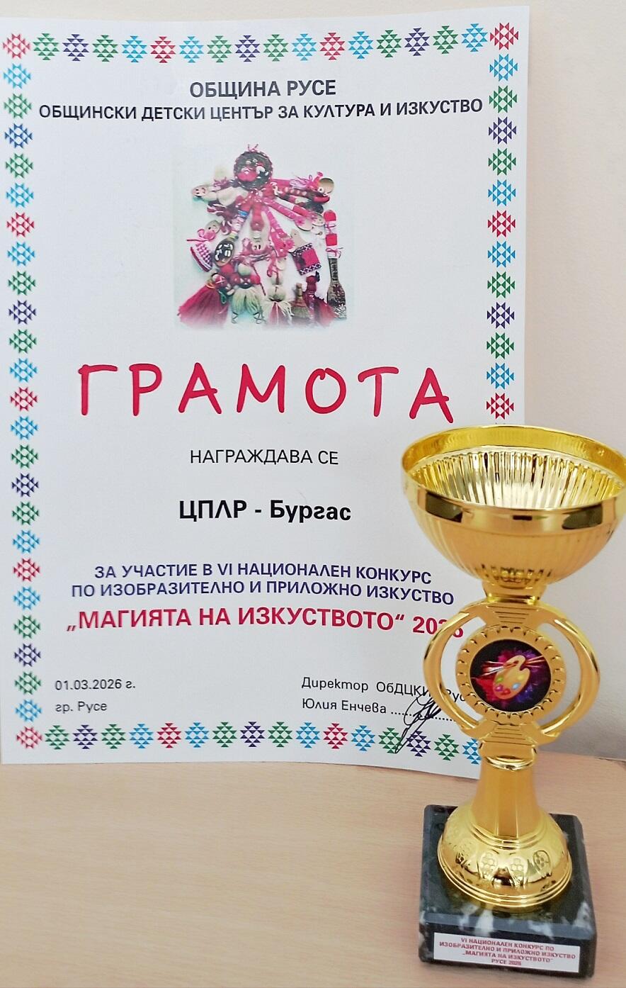 Участниците от групите по изобразително изкуство с ръководител Севина Трайкова към Центъра за подкрепа за личностно развитие – Бургас бяха отличени в Националния конкурс по изобразително и приложно изкуство „Магията на изкуството“. Организатор на събитието е Общинският детски център за култура и изкуство – Русе (ОДЦКИ).