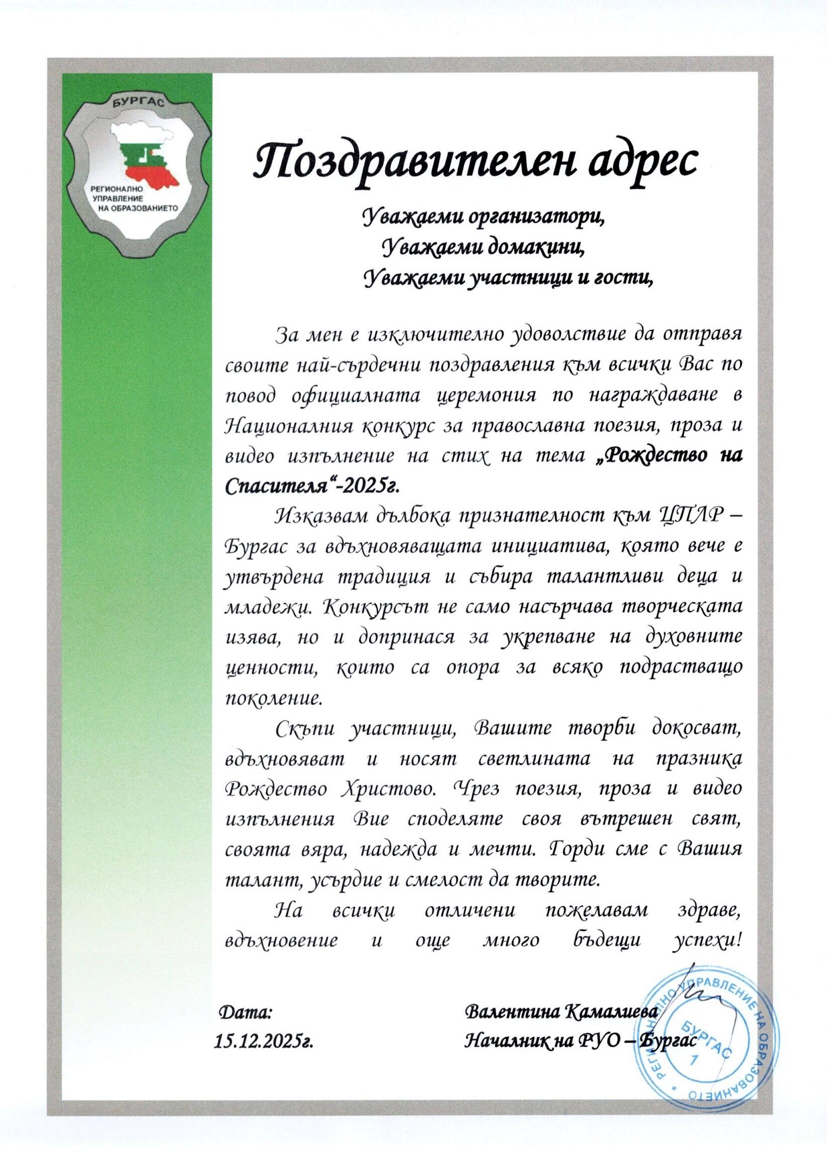 НАЦИОНАЛЕН КОНКУРС ЗА ПРАВОСЛАВНА ПОЕЗИЯ И ПРОЗА И ВИДЕОИЗПЪЛНЕНИЕ НА СТИХ НА ТЕМА "РОЖДЕСТВОТО НА СПАСИТЕЛЯ" - 2025 г.