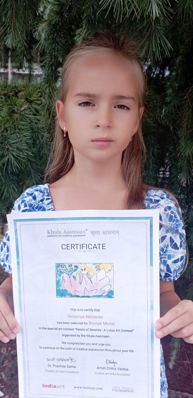 „Венчелистчетата на спокойствието “ зарадваха с бронзов медал Виктория Куценко от школата по рисуване към ЦПЛР-Бургас на специален конкурс за изкуство „Лотос“, организиран от фондация „ Арт Индия “, град