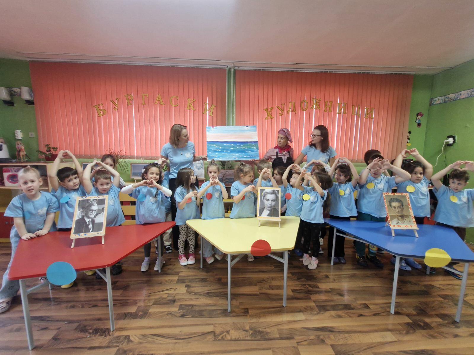 В хода на педагогическата ситуация малките възпитаници се докоснаха до творчеството на значими бургаски художници като Георги Баев, Виолета Масларова и Петко Задгорски. Чрез подготвена изложба с техни произведения децата откриха красотата на морските пейзажи, богатството на цветовете и силата на художественото послание. Те се включиха активно в беседи, творчески задачи и арт дейности, изразявайки своите впечатления и емоции.