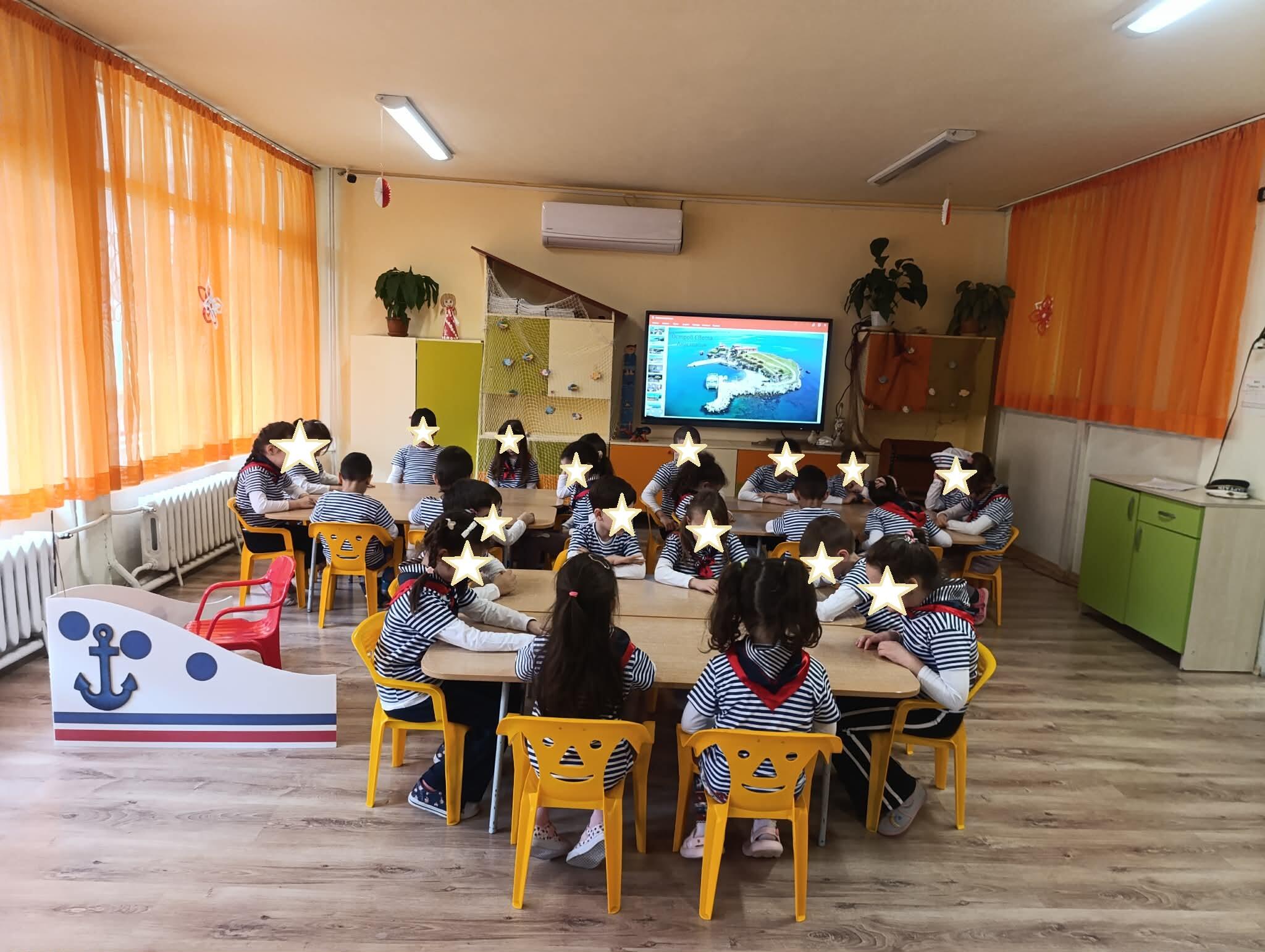 Малките възпитаници посрещнаха гостите, облечени в моряшки блузи, и се впуснаха във виртуално пътешествие до един от символите на града – Остров Света Анастасия. Пътуването се осъществи с „кораб“, носещ името на острова, а в ролята на капитан влезе дете от групата, което уверено „поведе“ екипажа към крайната дестинация.